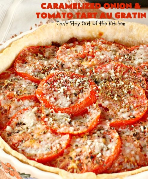 Caramelized Onion and Tomato Tart Au Gratin is absolutely A-M-A-Z-I-N-G!!! This delicious side dish includes lots of caramelized onions in a homemade pie crust. It’s topped with four cheeses! It’s layered with sliced tomatoes, several delicious herbs and has more cheese on top. Spectacular is about the only word worthy of this fabulous tomato tart recipe. My mouth is watering just thinking about the awesome texture and flavors of this tomato and onion pie.