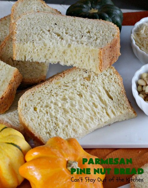 I love Parmesan Pine Nut Bread! I made a batch of this delicious bread for company a few weeks ago. It turned out spectacularly. No kidding. I really enjoy Greek or Italian-type breads anyway. This great recipe includes Parmesan cheese, pine nuts and Italian seasoning, which provide really nice flavors and depth to the bread.