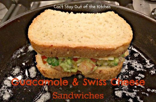 It’s only very rare foods that I can do that with and sandwiches aren’t one of them! Well, Guacamole and Swiss Cheese Sandwiches are right up my alley. Lots of gooey deliciousness, lots of flavor, lots of texture, and not the same-old-same-old tired varieties of most sandwiches.