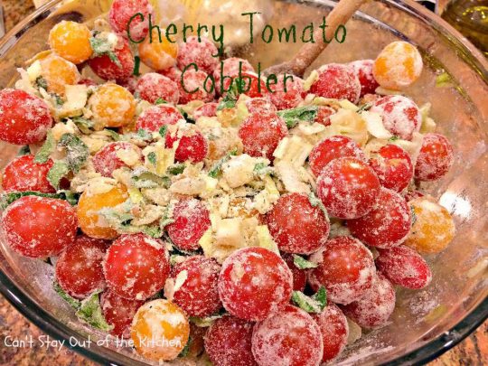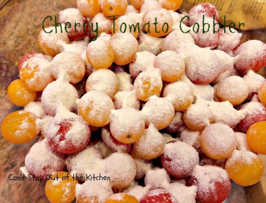 Oh, my goodness, Cherry Tomato Cobbler is spectacular. Who would have ever thought??!! Lots of cherry tomatoes and sunburst cherry tomatoes are covered with a cobbler and cheese topping that’s out-of-this-world. This was really a hit when I served it for dinner last week. Everyone who comes to our house for meals is always a guinea pig for at least one dish.