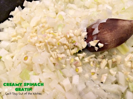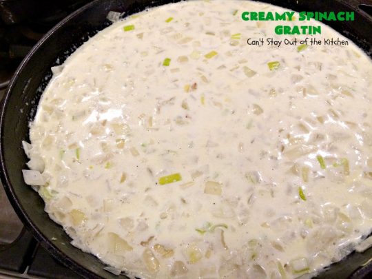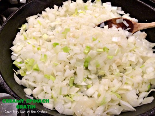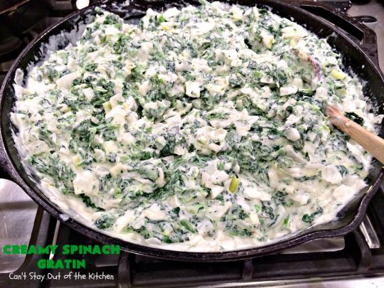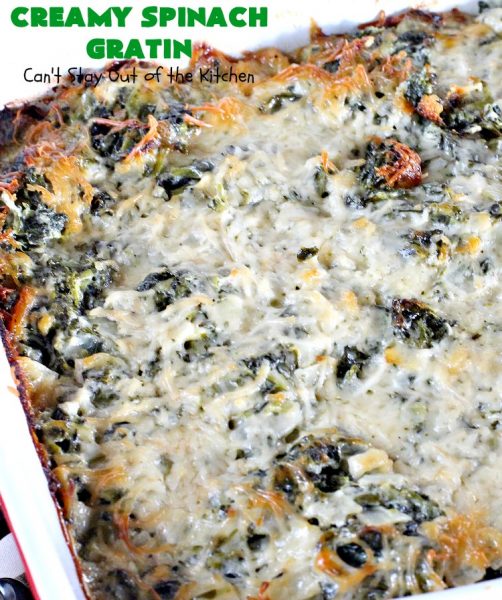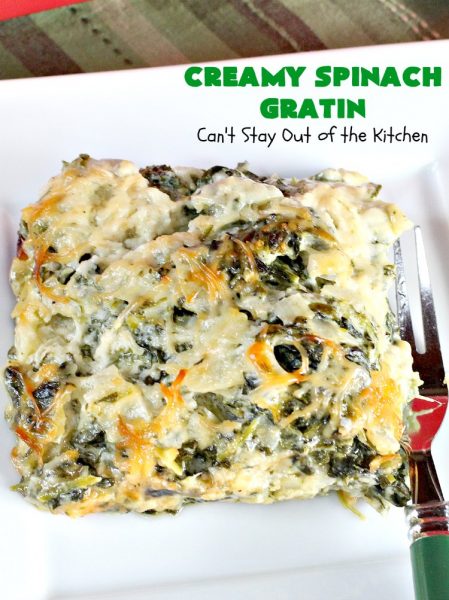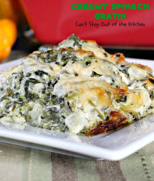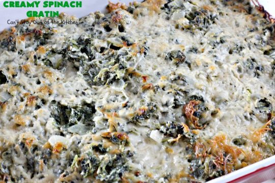 If you’re looking for a “to die for” spinach recipe, then Creamy Spinach Gratin should be included in that quest. It’s rich, creamy, cheesy, with one of the best combinations of flavors, textures, and eye appeal I’ve ever found in a spinach recipe before. I loved it and our guests raved over it! Yay.