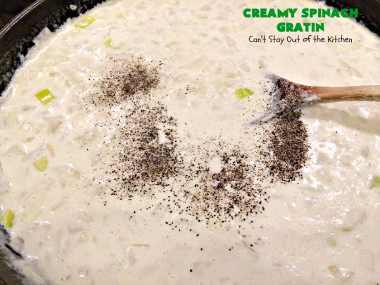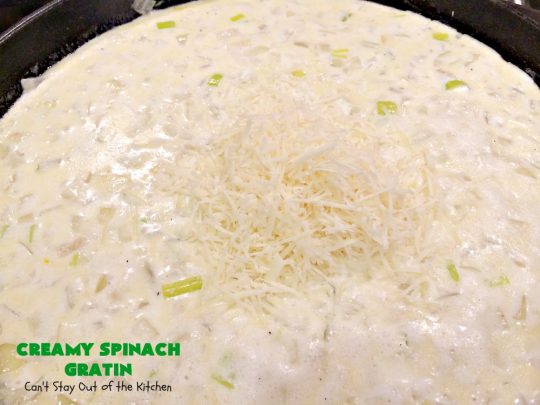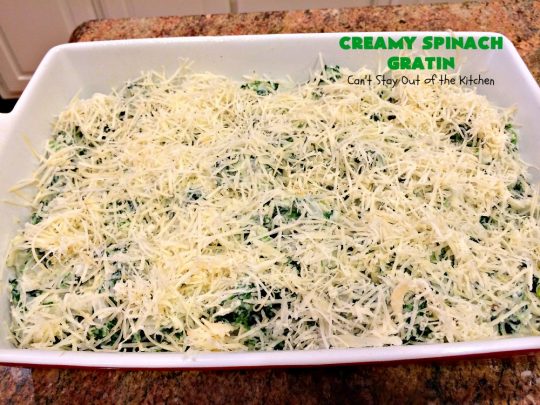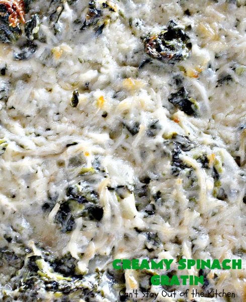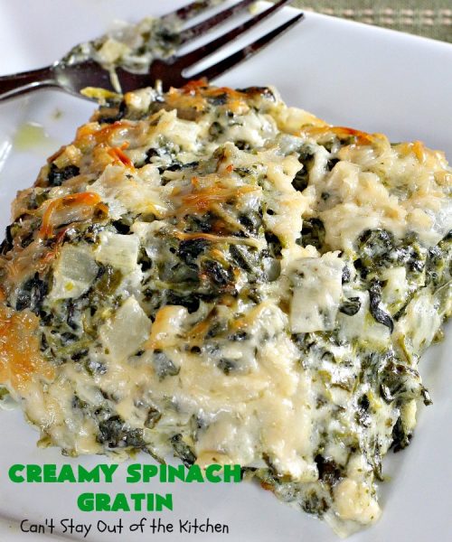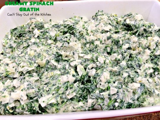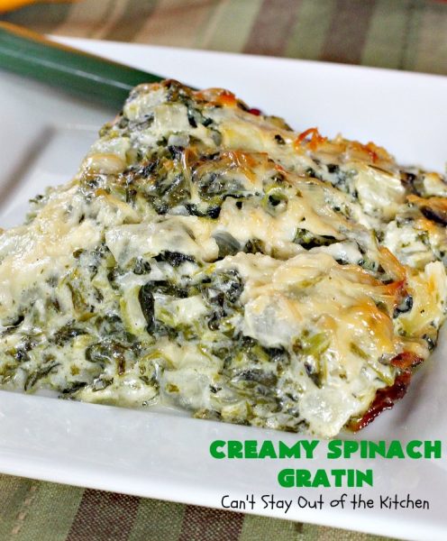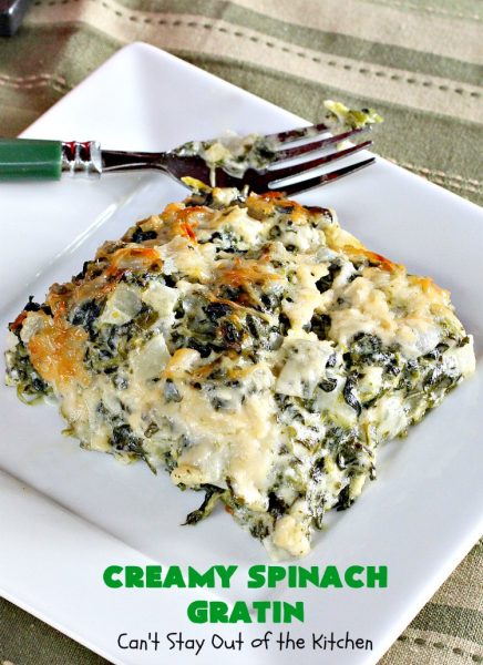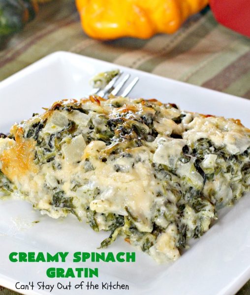 Creamy Spinach Gratin is probably the BEST spinach casserole I’ve ever consumed. It was totally awesome served with Baked Parmesan Chicken.