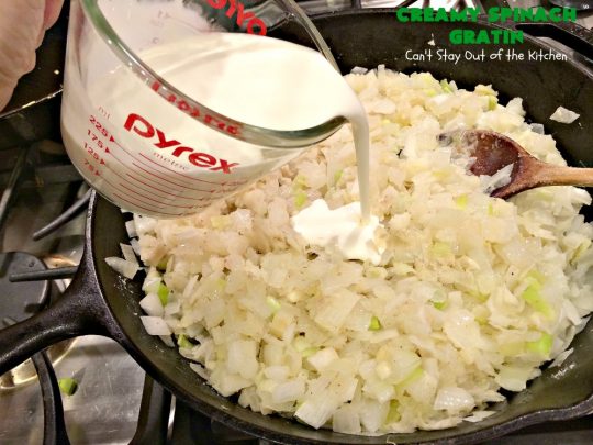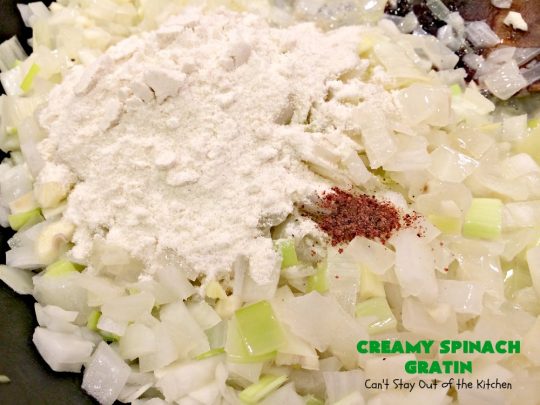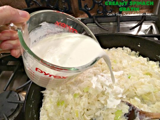 There’s lots of spinach in a really thick creamy sauce. I used half-and-half, heavy whipping cream, Parmesan cheese and Gruyere cheese. Wow did this casserole burst with flavor. Creamy Spinach Gratin also has onion, leeks and garlic which add delicious, savory flavors as well. I made this recipe using gluten free flour, too, so it’s gluten free for those with gluten intolerance. (But you can always use regular flour if you don’t have gluten allergies). Creamy Spinach Gratin is irresistible, sumptuous, heavenly!