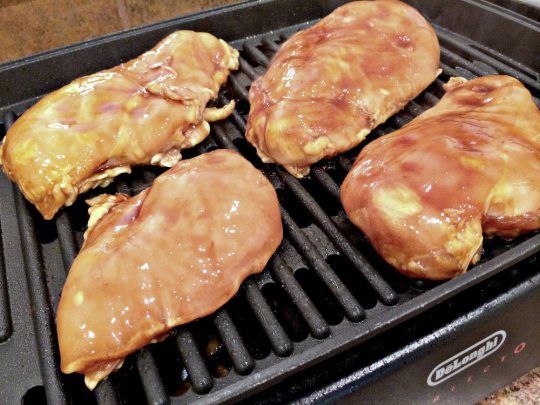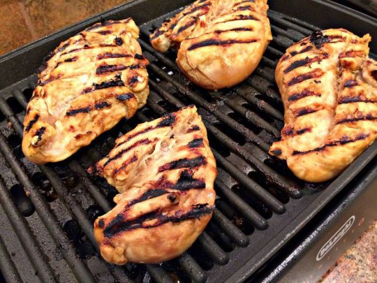 After marinating chicken, place on hot grill that’s been sprayed with cooking spray.