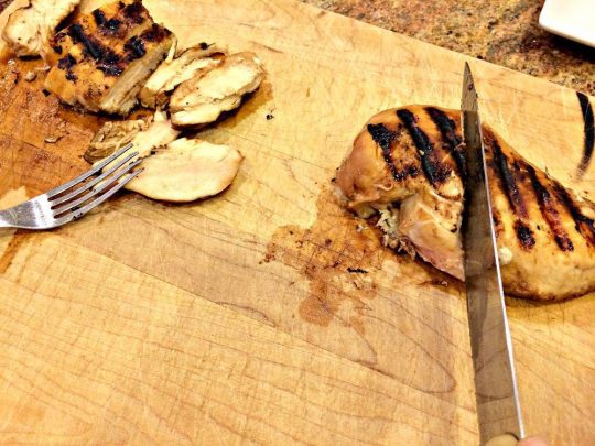 Remove chicken from grill and slice down into slices. Set aside. The actual recipe calls for four chicken breasts.