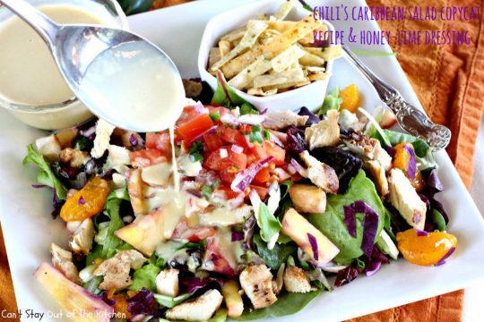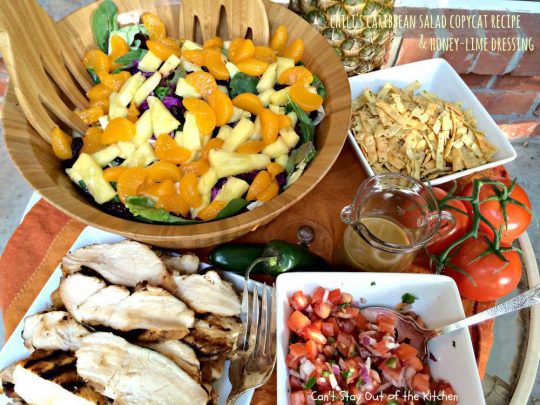 Chili’s Caribbean Salad Copycat Recipe with Honey-Lime Dressing is really tasty with lovely Caribbean flavors from the pineapple and mandarin oranges and the delicious Honey-Lime Dressing!