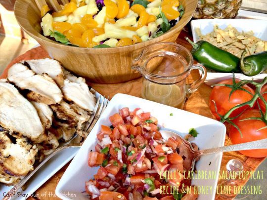 Doesn’t Chili’s Caribbean Salad Copycat Recipe with Honey-Lime Dressing look wonderful??!!! 🙂 Each mouthful is filled with wonderful tastes and textures. Yum.