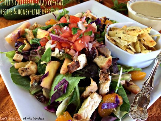 Each mouthful of Chili’s Carribbean Salad Copycat Recipe with Honey-Lime Dressing is filled with succulent chicken, luscious pineapple and mandarin oranges. The zippy Honey-Lime Dressing pulls it all together. Aren’t you ready to make this for your family soon?