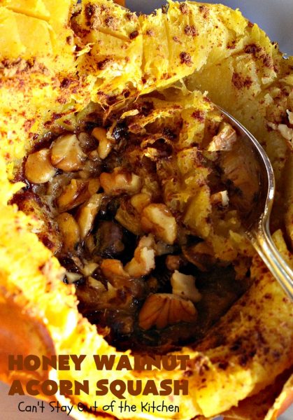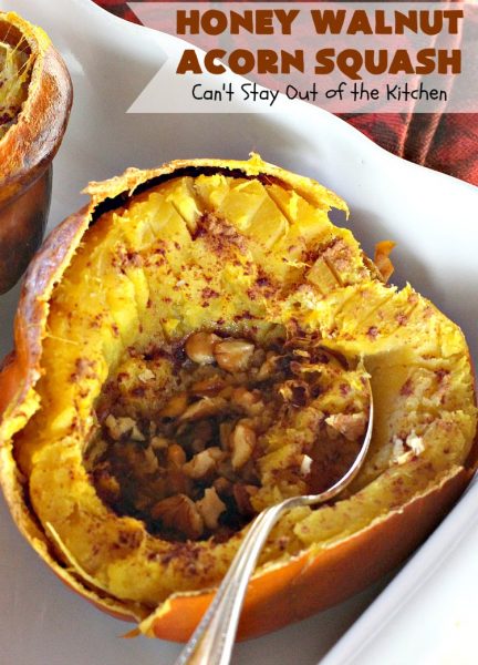 The walnuts roast as they bake adding a delicious deep and nutty flavor to the squash. Cinnamon and honey als0 enhance the flavor of this delicious squash dish.