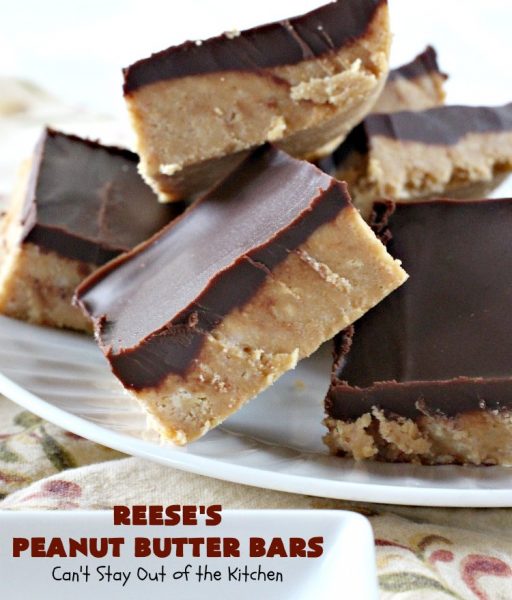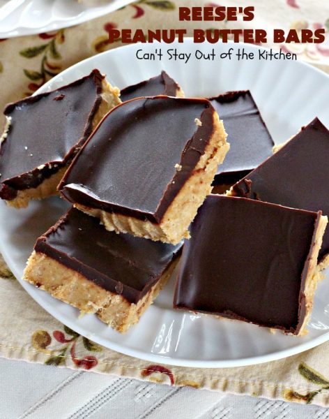 Reese's Peanut Butter Bars | Can't Stay Out of the Kitchen | this spectacular #dessert is rich, decadent & divine! It uses only 5 ingredients. It's a fantastic #copycat #recipe for #ReesesPeanutButterCups. No kidding! Perfect for #tailgating parties & potlucks, or #holidays like #MemorialDay or #FathersDay. #cookie #chocolate #brownie #ChocolateDessert #PeanutButterDessert #ReesesPeanutButterBars
