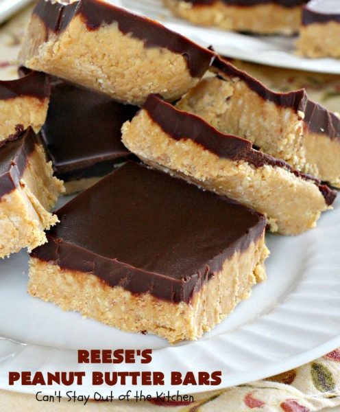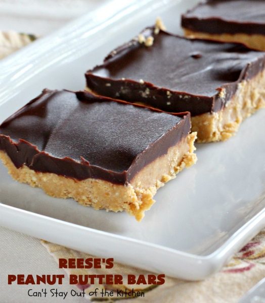 Reese’s Peanut Butter Bars are outstanding. These delicious no-bake bars taste just like eating Reese’s Peanut Butter Cups! They’re perfect for holiday baking, tailgating parties or potlucks. Every bite will have you drooling and coming back for more. Quick and easy recipe will become a family favorite since these bars are rich, decadent and irresistible.