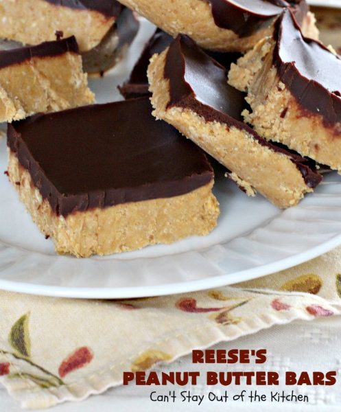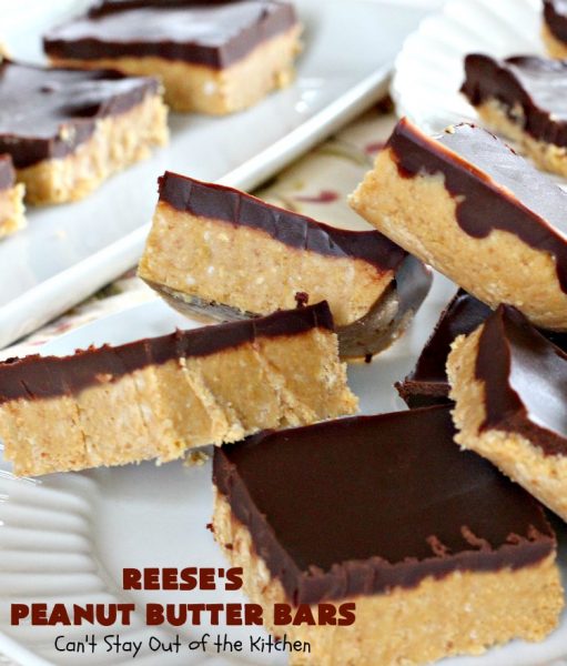 Delicious no-bake bar that tastes just like eating Reese’s Peanut Butter Cups! Quick and easy, too.