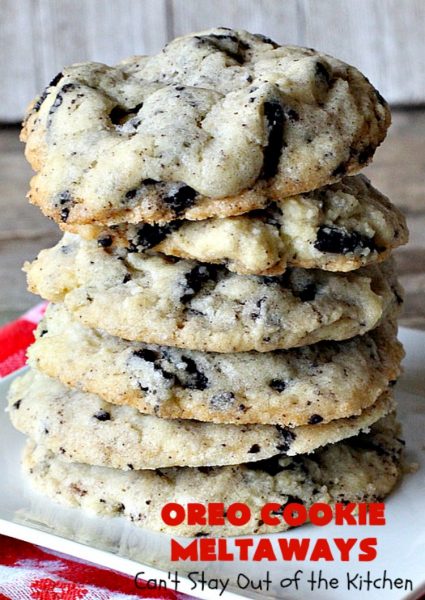 Oreo Cookie Meltaways are marvelous. What’s not to love about a cookie with Oreos in it? These are melt-in-your-mouth sugar cookies for sure. Then they’re stuffed with Oreo cookie chunks. They are sweet, rich, decadent, chocolatey, and have wonderful texture.