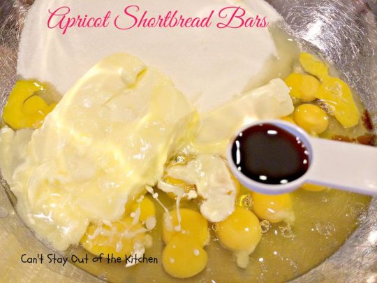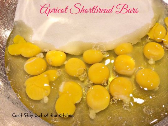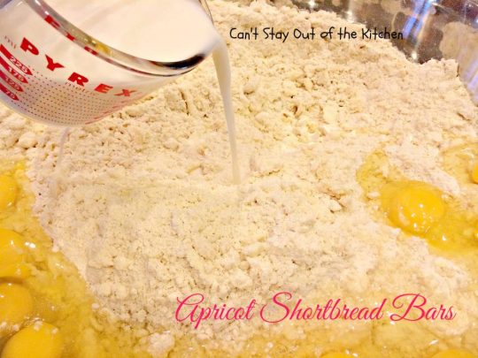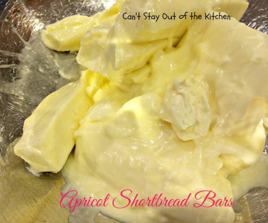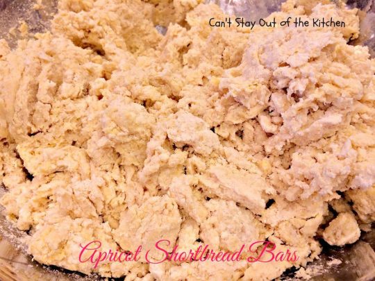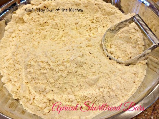 Back in the 1980s Willard Scott used to be a national well-known weatherman. He shared a family recipe (from his grandmother, I think) for Raspberry Squares that I clipped out and made right away. These bars were so scrumptious that over the years I’ve made them with several different jellies. Not just raspberry. I’ve also made them for our annual Christmas Cookie Extravaganza before. I had all these jars of apricot preserves that I wanted to clear out of my pantry. So I decided to use his wonderful recipe and substitute apricot preserves instead of raspberry. They turned out sensationally! This particular recipe is also good with strawberry, blackberry and blueberry jams, too.