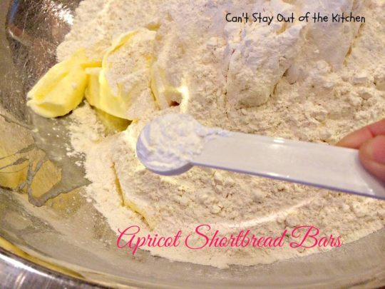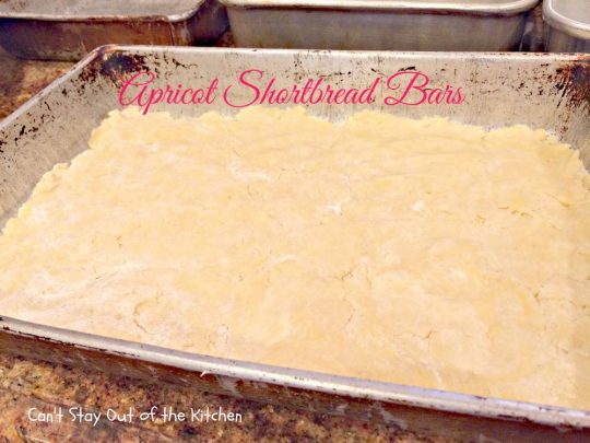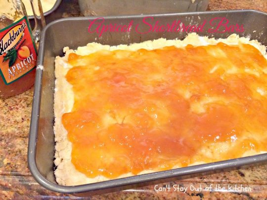 This recipe for Apricot Shortbread Bars is a goldmine. Especially if you are near fruit orchards and put up several different types of jams or preserves every year. Even if you don’t make your own jellies, you can easily buy any kind of jelly you like, and use this basic recipe with them. Any flavor will work. I will tell you that I used mostly Blackburn preserves and they worked the best. Some of the cheaper jellies were too thick and didn’t spread as easily. Jellies actually spread a little easier. Another option is to melt the preserves a little if they seem too thick to spread over the crust layer.