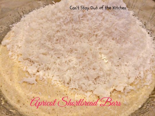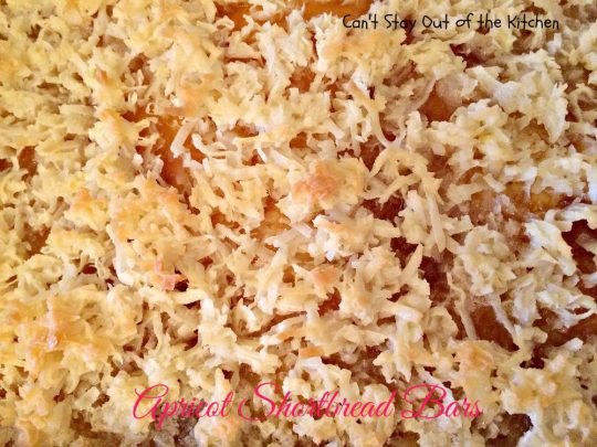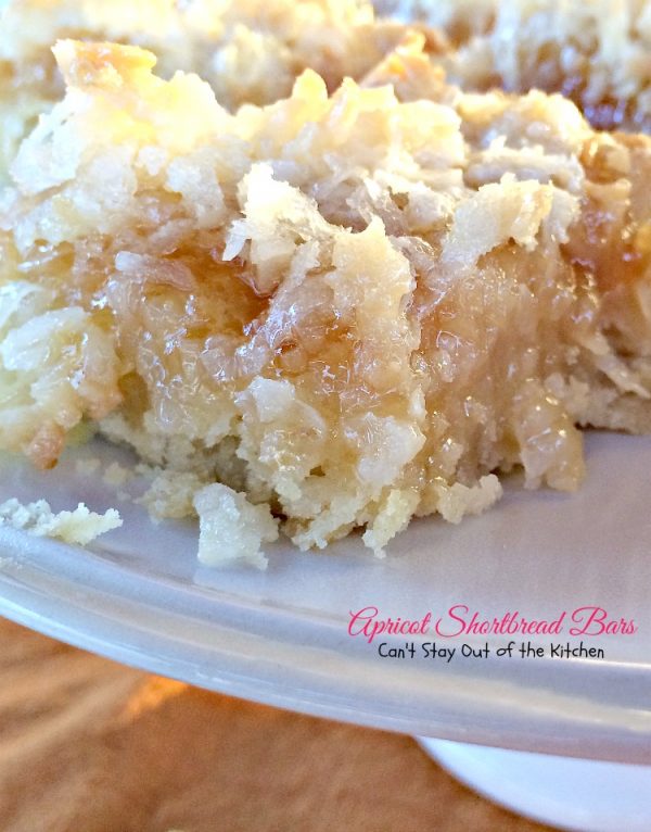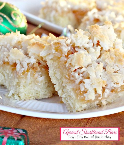 Apricot Shortbread Bars are so fabulous! We delivered our Christmas cookies last week and already, these delicious bars have received all kinds of attention and praise! This dessert has a tasty shortbread crust, then they’re spread with apricot preserves. The topping is almost like a macaroon topping with lots of coconut. This recipe does have several steps, but the outcome is so amazing you will want to make these for sure!