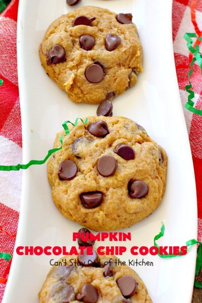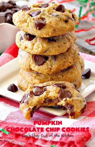 These delectable Pumpkin Chocolate Chip Cookies are perfect for fall baking, holiday parties, Christmas Cookie Exchanges and even tailgating parties!