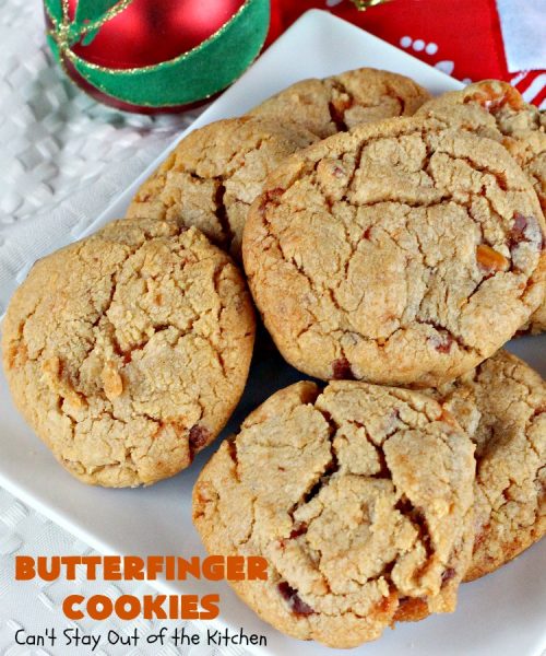 This is a sensational cookie for holiday baking. But it’s also terrific any time of the year for potlucks, tailgating parties, the Super Bowl or Valentine’s Day. You should definitely give Butterfinger Cookies a try if you enjoy chocolate or peanut butter desserts. You’ll be hard pressed to eat only one. And, you’ll be lucky if your family shares any with you! 🙂