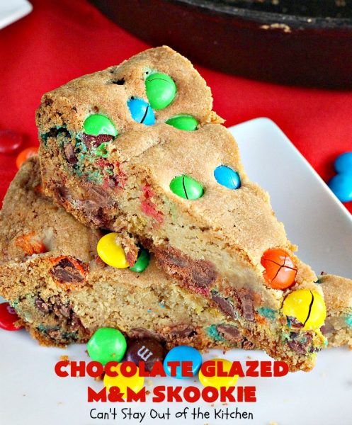 Chocolate lovers beware! This Chocolate Glazed M&M Skookie is absolutely amazing. A delicious glaze of melted chocolate and vanilla chips is drizzled over luscious wedge-shaped M&M skookies. So you get a double dose of chocolate in a sensational chocolate chip cookie. The mixture is baked in a cast-iron skillet, so voila! Skookie. 🙂
