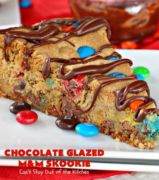 Chocolate Glazed M&M Skookie is a mouthwatering chocolate chip cookie-type recipe. Chocolate chips and vanilla chips melted together are drizzled over the top. Yum.