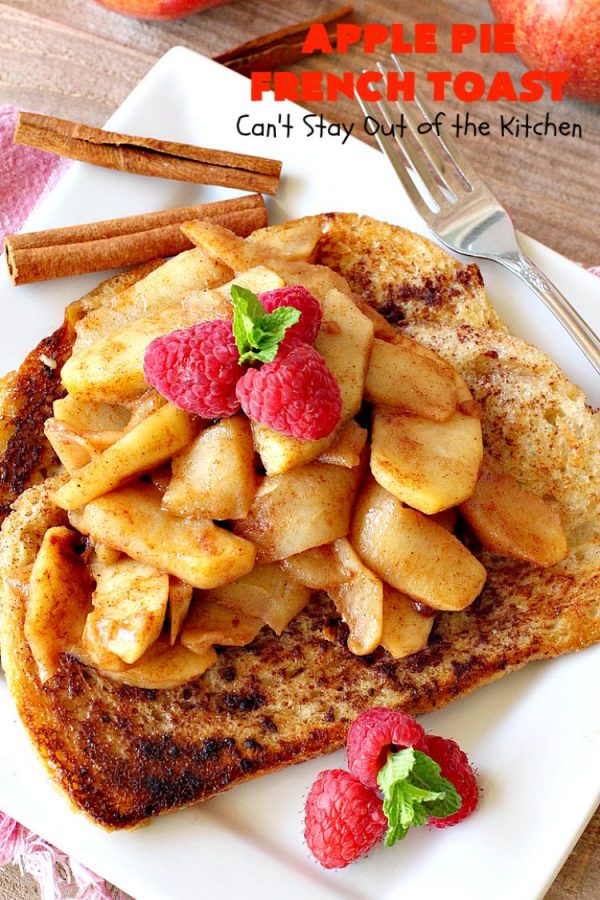 Apple Pie French Toast is absolutely mouthwatering. So drool worthy. Unbelievably sensational. Such comfort food. I love this delicious Apple Pie French Toast recipe! A few weeks ago I was in the mood for French toast. I wanted to serve it with sauteed apples and maple syrup rather than just plain with maple syrup. I concocted this delicious recipe that uses lots of spices in the apples, as well as in the French toast batter.