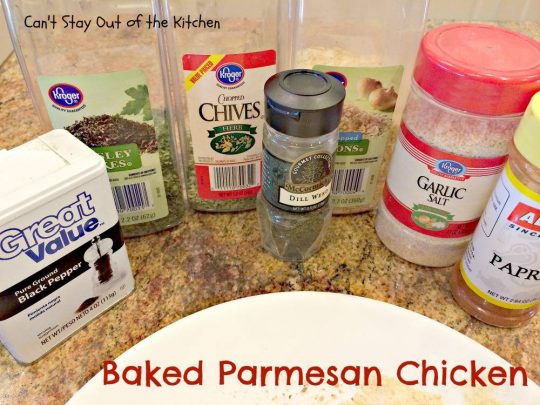 Place Italian style bread crumbs and parmesan cheese on a plate. Add pepper, parsley, chives, dill weed, garlic salt, paprika and dehydrated onions.