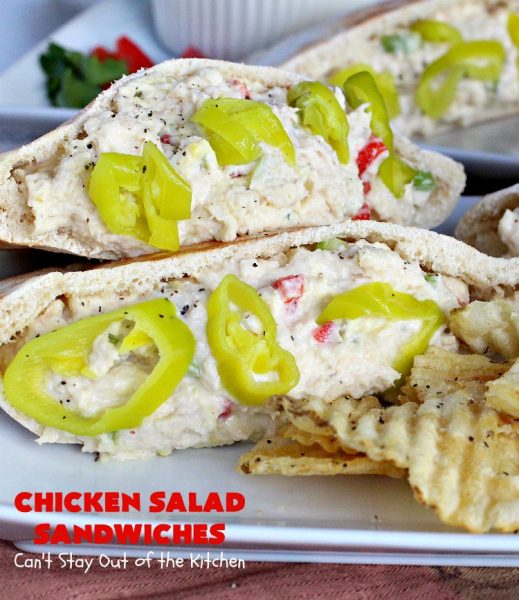 This close up shows the texture of Chicken Salad Sandwiches. I served these Chicken Salad “Sandwiches” in pita pockets garnished with sliced pepperocinis because I ran out of salad pepper rings.
