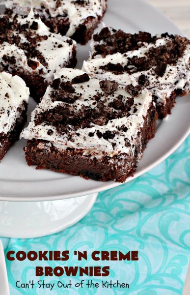 Cookies ‘n Creme Brownies are great to whip up for any occasion. They are especially good for parties, special occasion baking like Valentine’s Day or other holidays. When you want to WOW your company with your latest culinary creation, make a batch of these brownies! Better grab one quickly, though, before they’re all gone!