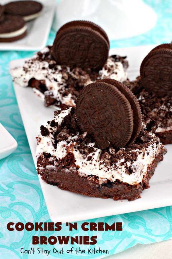 Cookies ‘n Creme Brownies are great to whip up for any occasion. They are especially good for parties, special occasion baking like Valentine’s Day or other holidays. When you want to WOW your company with your latest culinary creation, make a batch of these brownies! Better grab one quickly, though, before they’re all gone!