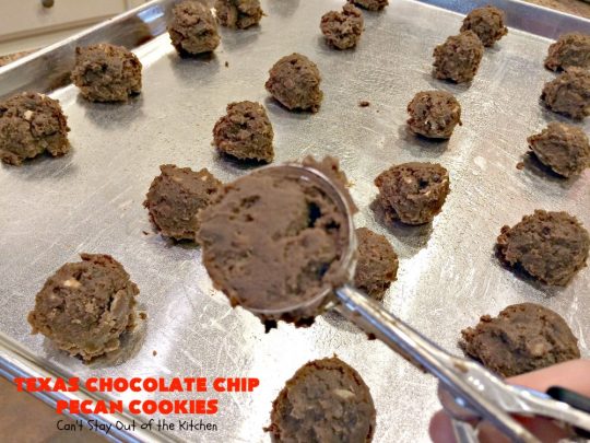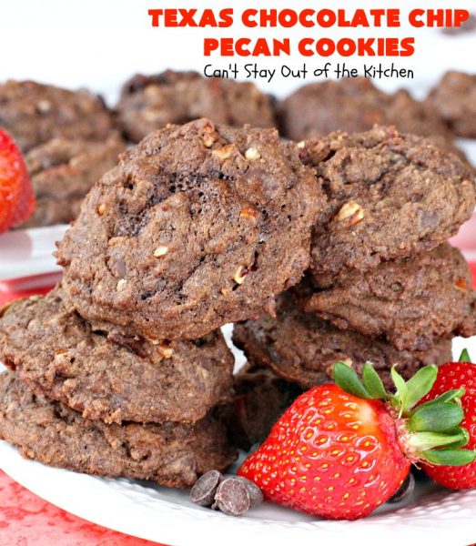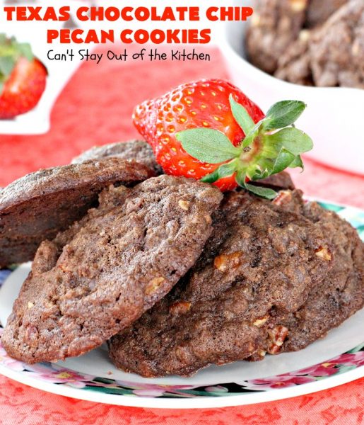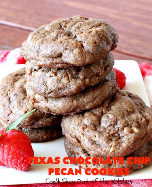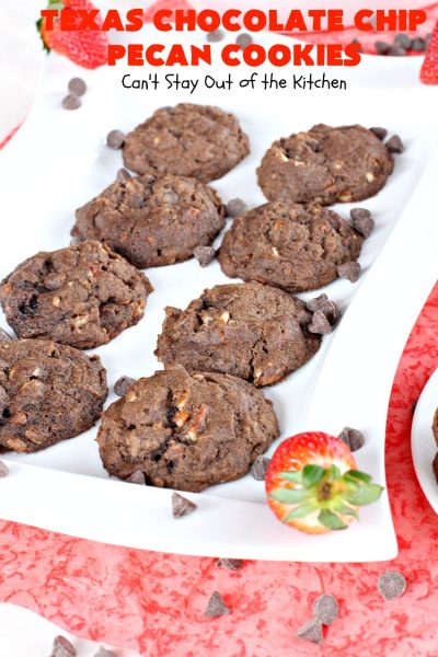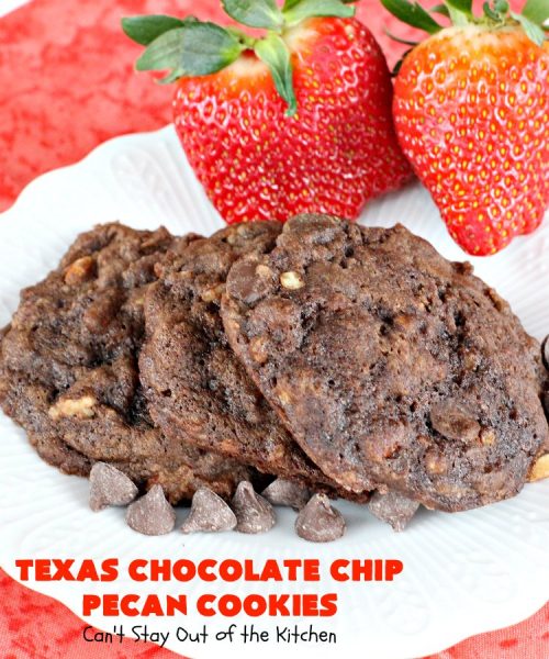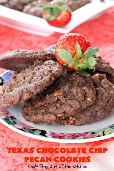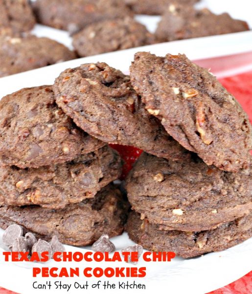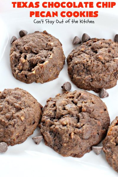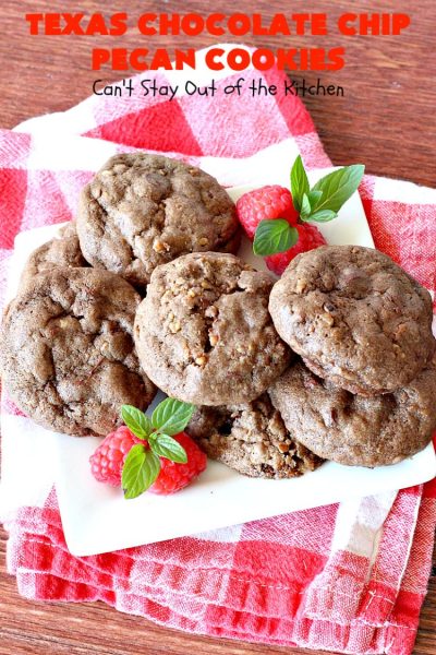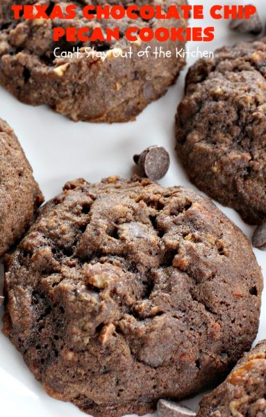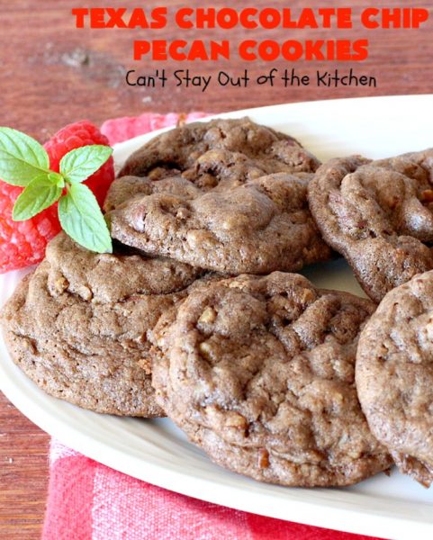 These lovely Texas Chocolate Chip Pecan Cookies are wonderful. They’re perfect for a Christmas Cookie Exchange or sharing with friends and co-workers during the holiday season. I hope you give ’em a try. 🙂