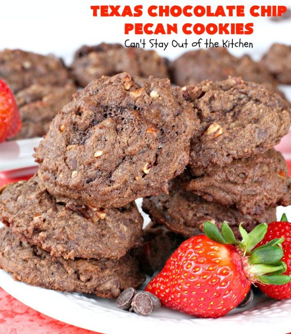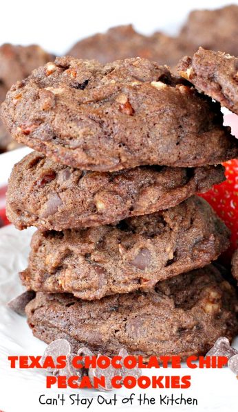 Texas Chocolate Chip Pecan Cookies are amazing. Lovely chocolate cookies are filled with chocolate chips and pecans. They’re soft and chewy with a tiny bit of crunch from the pecans. Yum.