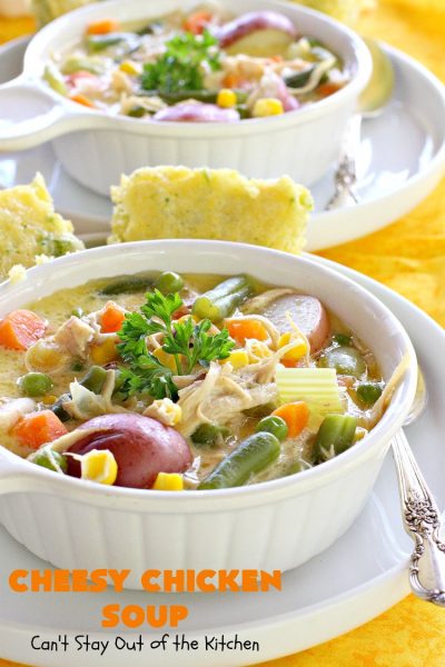 If you’re looking for a Cheesy Chicken Soup recipe that’s chocked full of veggies and has amazing taste, than make up a batch of this soup recipe sometime soon. It’s great reheated for lunches, and you can use rotisserie chicken and store bought chicken broth if that’s easier for you. Either way you make it you will find this soup very satisfying!