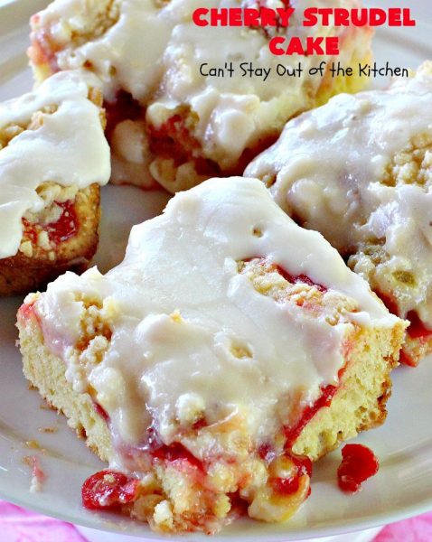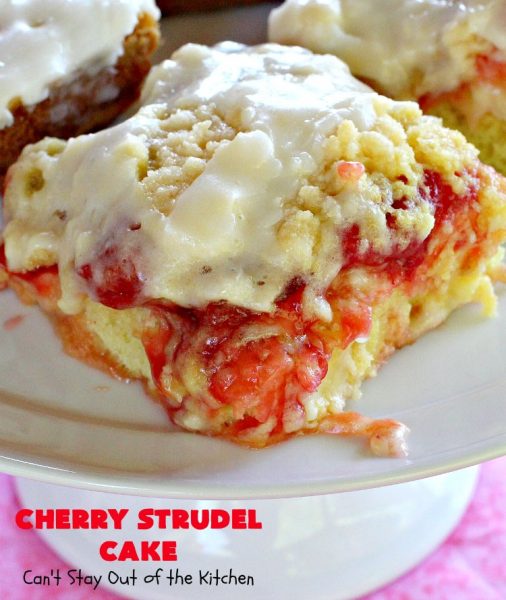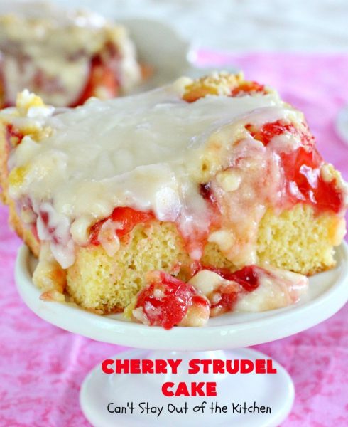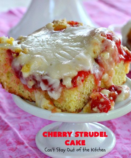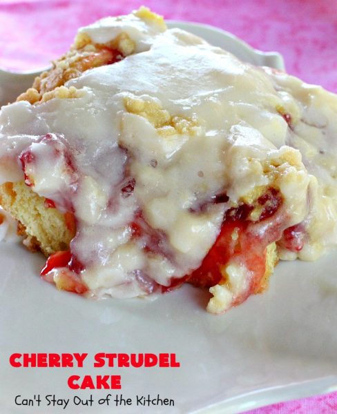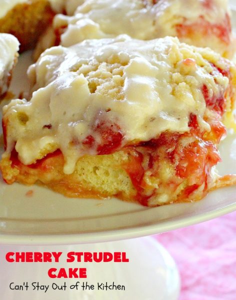 Cherry Strudel Cake really turns out more like a luscious and dreamy breakfast coffeecake rather than a typical dessert cake. But certainly you can serve it for either occasion, and it will be enjoyed by all. In the words of the family members who tasted Cherry Strudel Cake, “It was sooooooo good.” She also wanted the recipe, so I determined to get this one posted quickly.