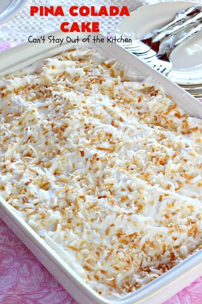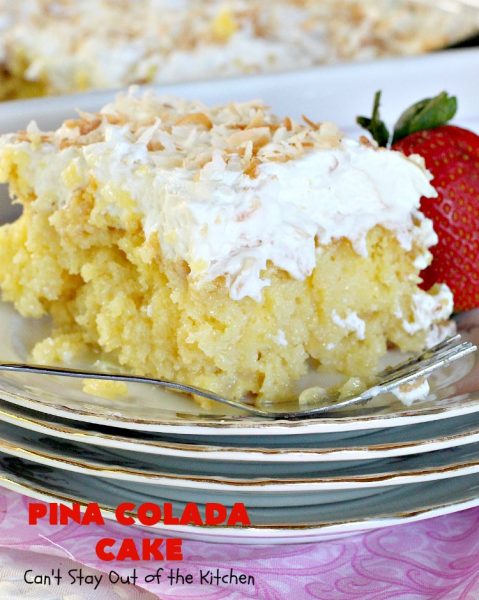 Pina Colada Cake | Can't Stay Out of the Kitchen | Best #PinaColada cake ever! This amazing #pokecake uses cream of coconut & sweetened condensed milk to make it exceptionally moist. It's terrific for potlucks, special occasions & #holidays.