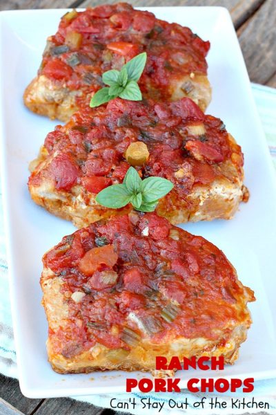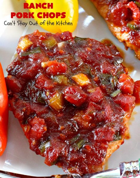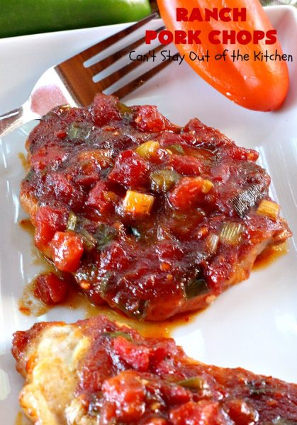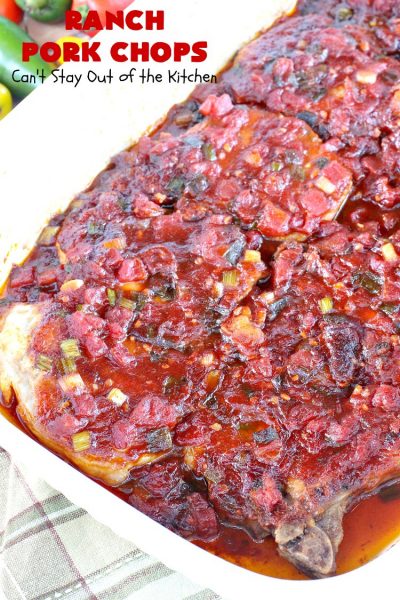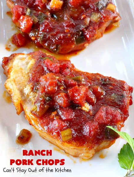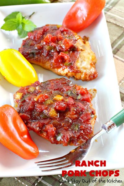 Ranch Pork Chops are outstanding! This tasty pork chop main dish is covered with a sauce made with Ranch dressing mix, chili sauce, diced tomatoes with green chilies, plum jelly, green onions and garlic. Terrific entree for family or company dinners.
