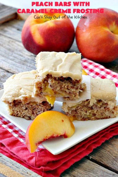 Peach Bars with Caramel Creme Frosting are rich, decadent and totally worth it!