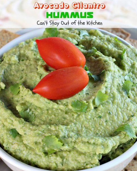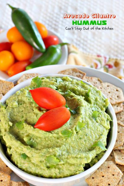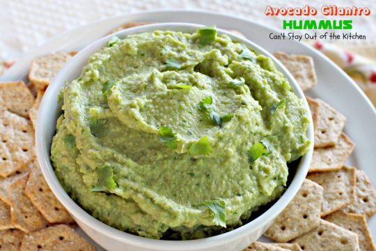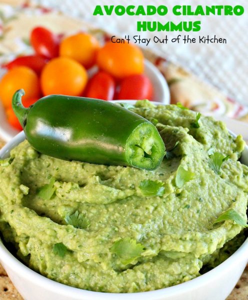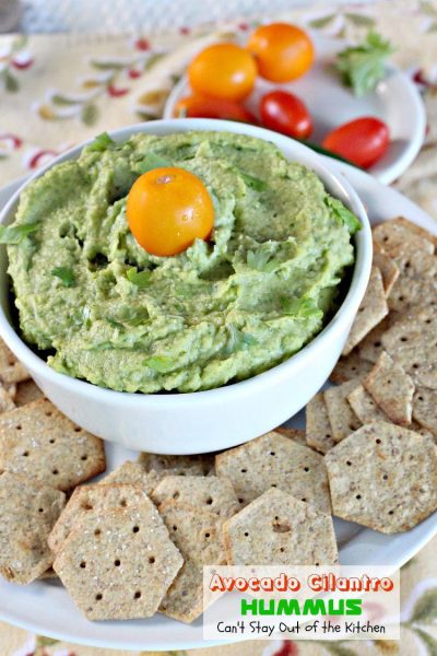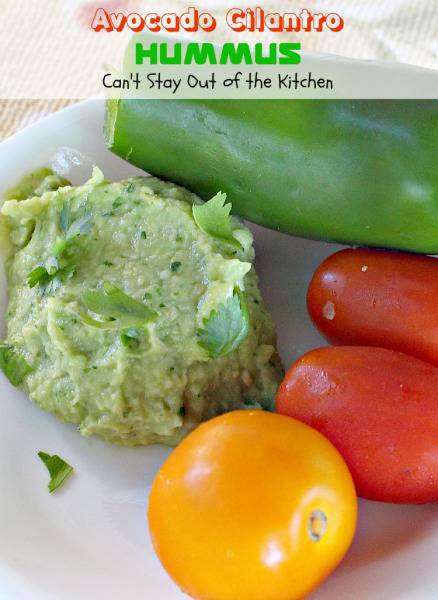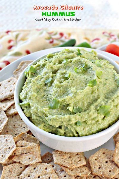 Avocado Cilantro Hummus is a delightful appetizer that’s great for any tailgating party. I love avocados. Guacamole is one of my favorite foods. I can eat avocados raw and plain, in tossed salads, marinated salads, pasta salads, appetizers, layered dips, sauces with pasta, sandwiches and, of course, in Taco Salads.