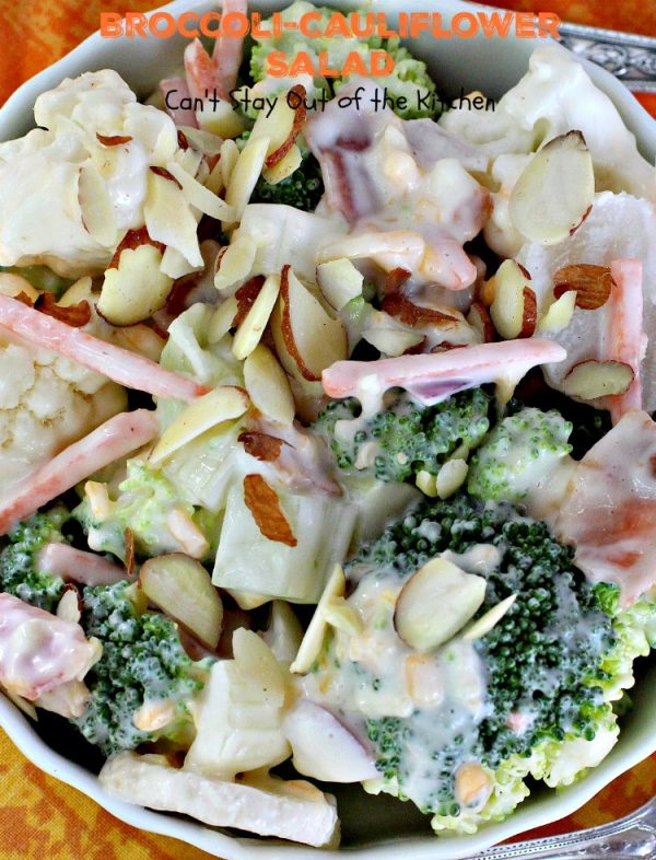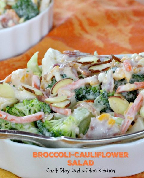 Broccoli-Cauliflower Salad is so good it’s sure to become a favorite. I LOVE, LOVE, LOVE this salad! It is so incredibly creamy and delicious. Broccoli-Cauliflower Salad is very crunchy because of the raw broccoli, cauliflower, carrots, celery, onions, almonds and cheese.