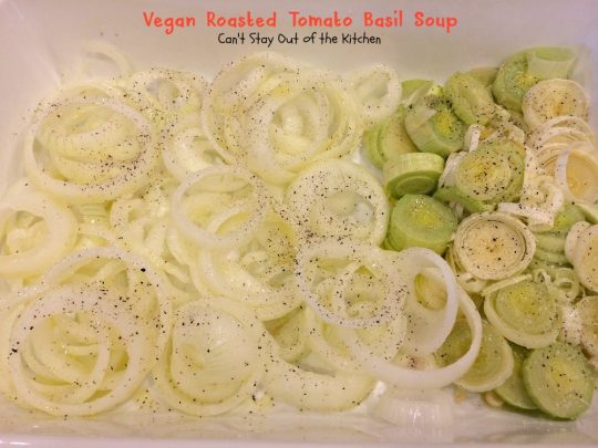 This is a savory and delicious Tomato Basil Soup recipe. It uses roasted vegetables to increase the flavor. I included garlic, tomatoes, leeks, onions and bell peppers. It also has typical herbs like basil and parsley. Just a sprinkling of crushed red pepper adds needed heat to spice up the soup.