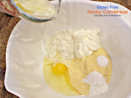 Gluten Free Honey Cornbread is filled with buttermilk, sour cream and butter which increase the moistness of the recipe. Molasses and honey add sweetening.