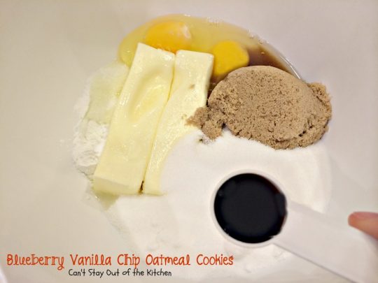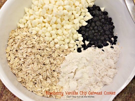 Stir in UNBLEACHED all-purpose flour. Bleached flour toughens baked goods. Add oatmeal, dried blueberries, and vanilla chips.