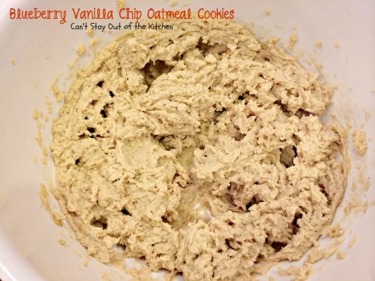 - Stir in flour, oats, vanilla chips and dried blueberries with a wooden spoon until very well combined.
