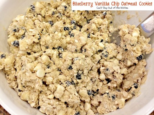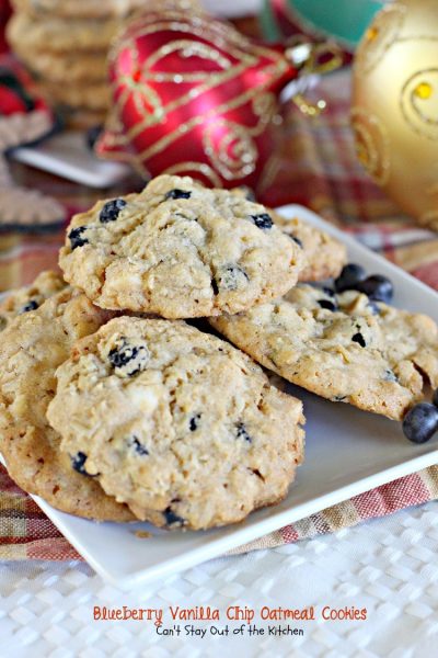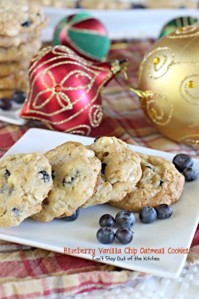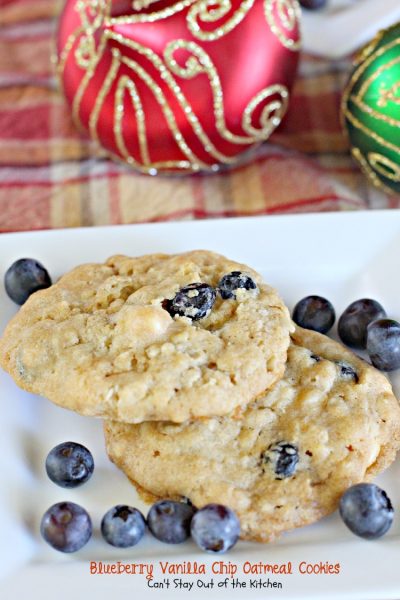 Blueberry Vanilla Chip Oatmeal Cookies are great for holiday baking. Dried blueberries work wonderfully in cookies.