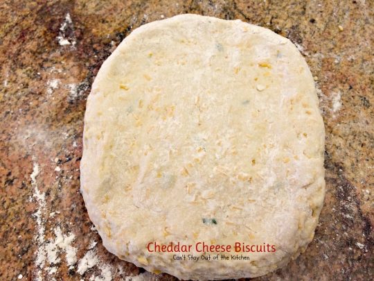 When biscuits are rolled out too thin, they’re not fluffy like they should be. I also realized that working the dough is not so difficult if I knead it just like I would bread dough. After about 3-5 minutes of working the extra flour into the dough it’s ready to be cut and be placed in the pan. The nice thing about Cheddar Cheese Biscuits is they don’t have to raise like homemade bread!