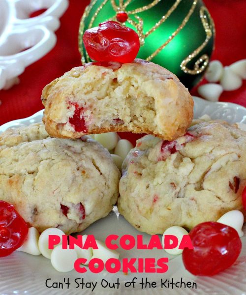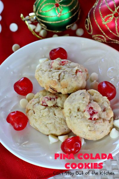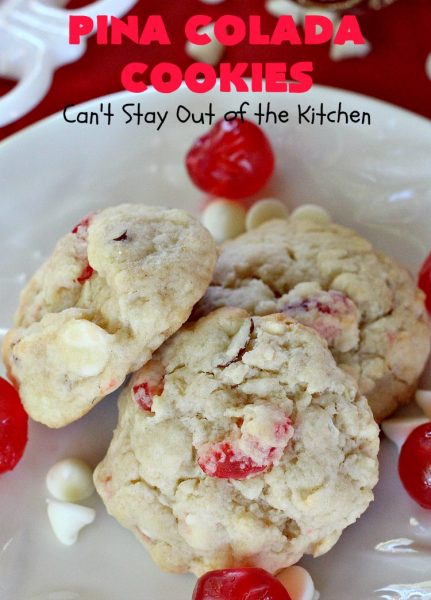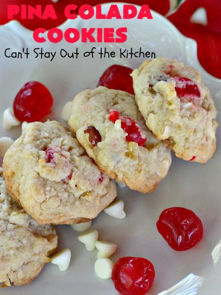 Back to Pina Colada Cookies. If you’re looking for a fabulous and festive cookie to take to your holiday parties, then I can highly recommend Pina Colada Cookies. They pack a powerful punch and will surely satisfy any sweet craving you or your family may have over the holidays. Enjoy.