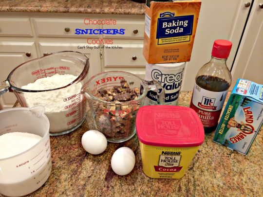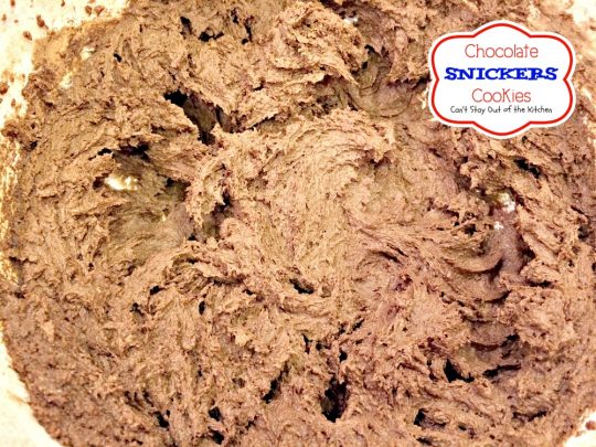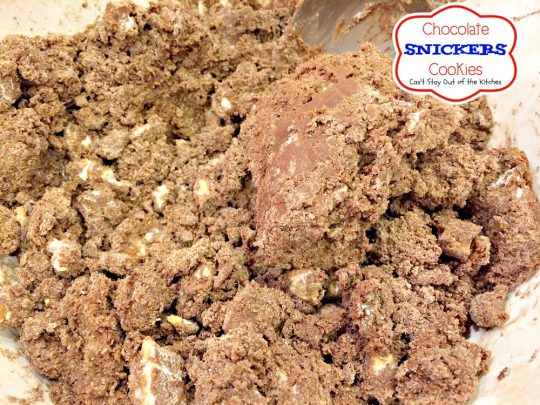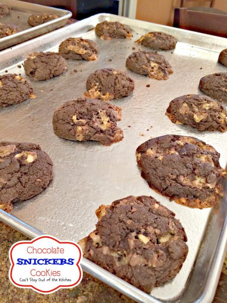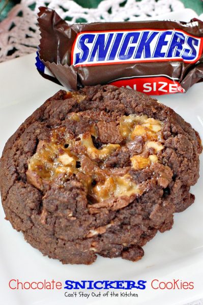 Every bite of these lovely chocolate cookies is filled with chopped Snickers bars providing wonderful peanut butter and caramel flavor.