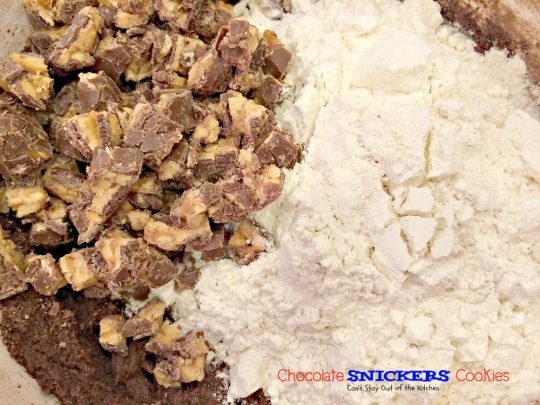 - Stir in UNBLEACHED all-purpose flour and chopped Snickers bars and stir until ingredients are very well combined.