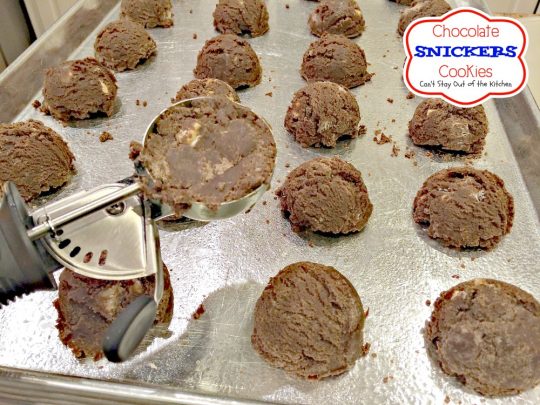 Chocolate Snickers Cookies are crispy on the outside and crunchy and chewy on the inside. If your mouth waters at the taste of Snickers bars, you’ll love these cookies. While I scooped my cookie dough with an ice cream scoop, these cookies can just as easily be rolled into balls.