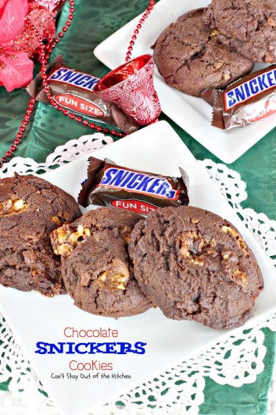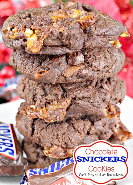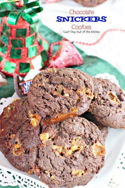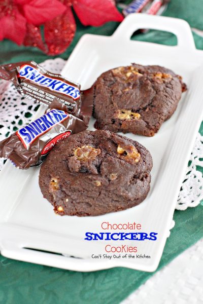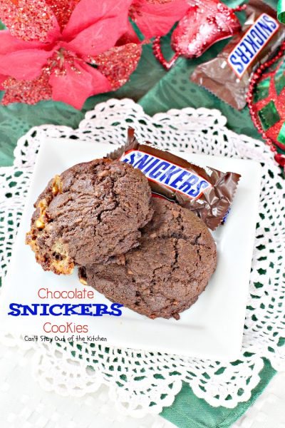 Chocolate Snickers Cookies are great for Christmas cookie exchanges or any holiday party.
