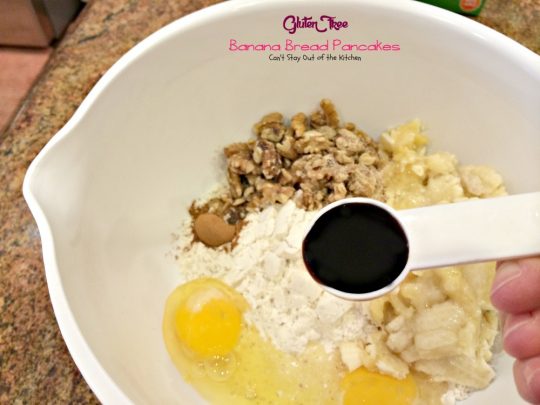 - Mix GF flour, milk, cinnamon, walnut halves, eggs, vanilla and mashed bananas in a large mixing bowl.